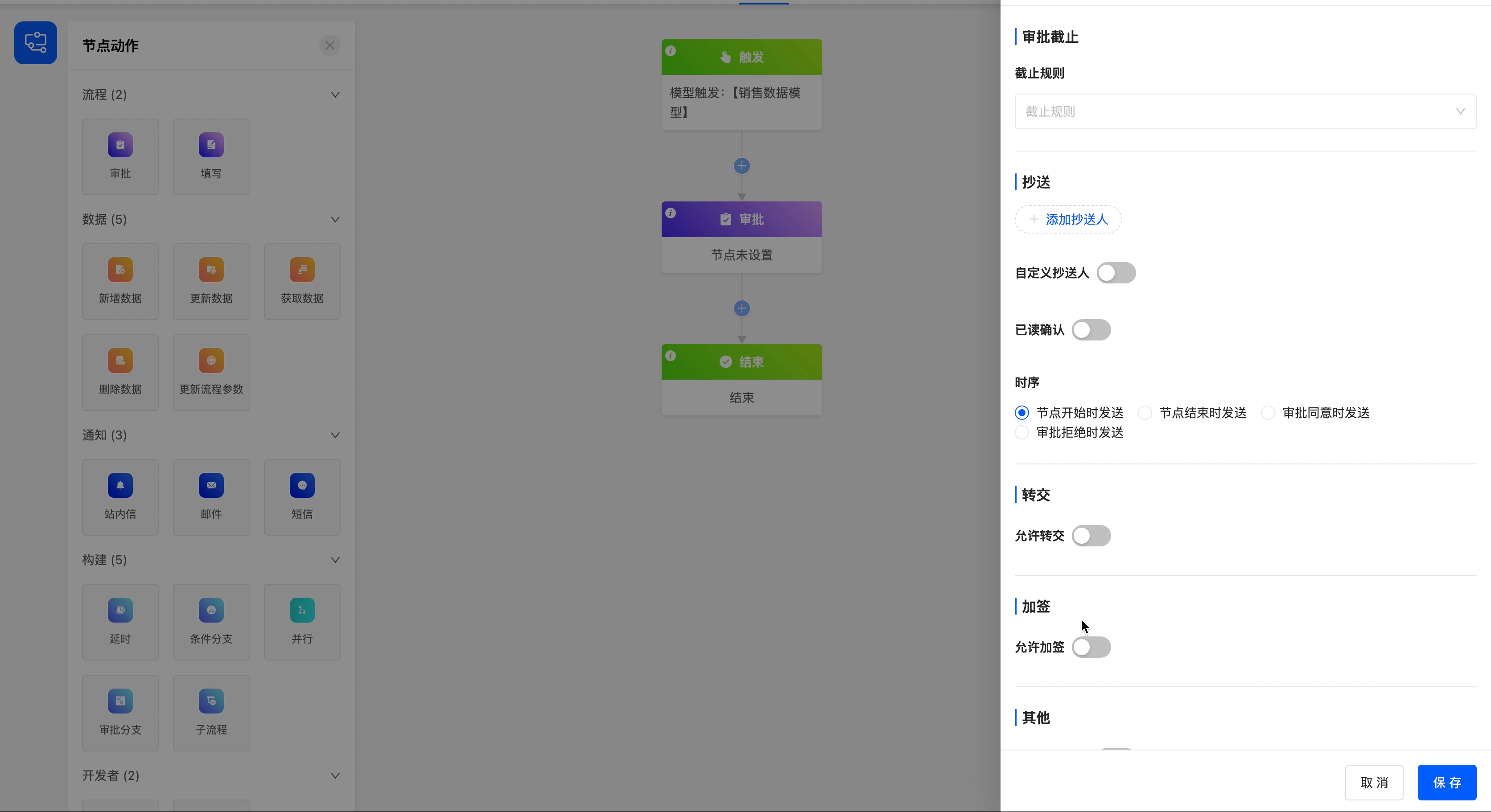 Select the model at the time of workflow trigger as the approval model, select the approval view under this model (which has been designed in the interface designer), and save the data after the node is executed.