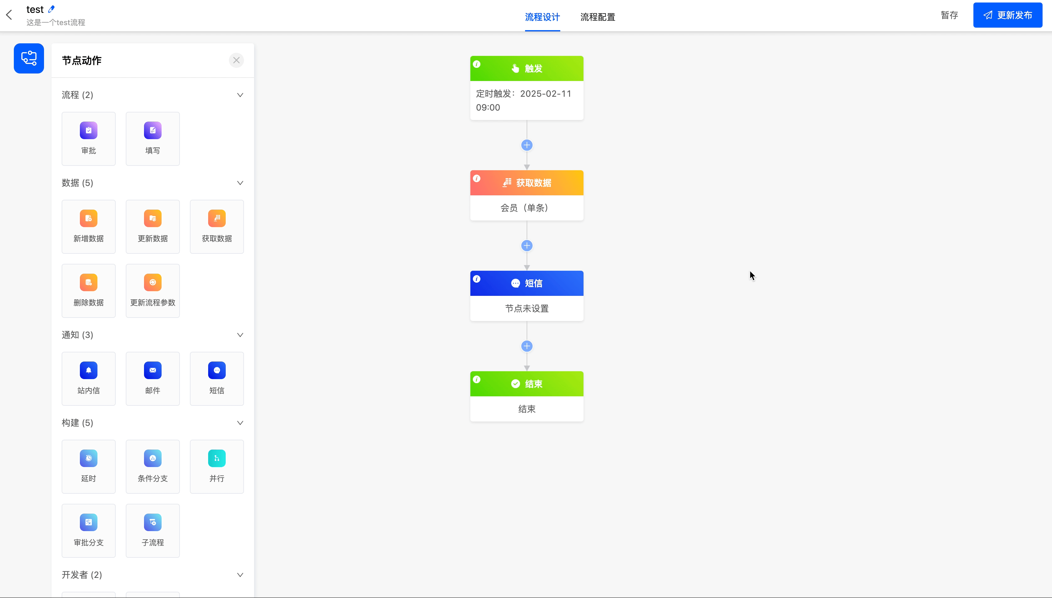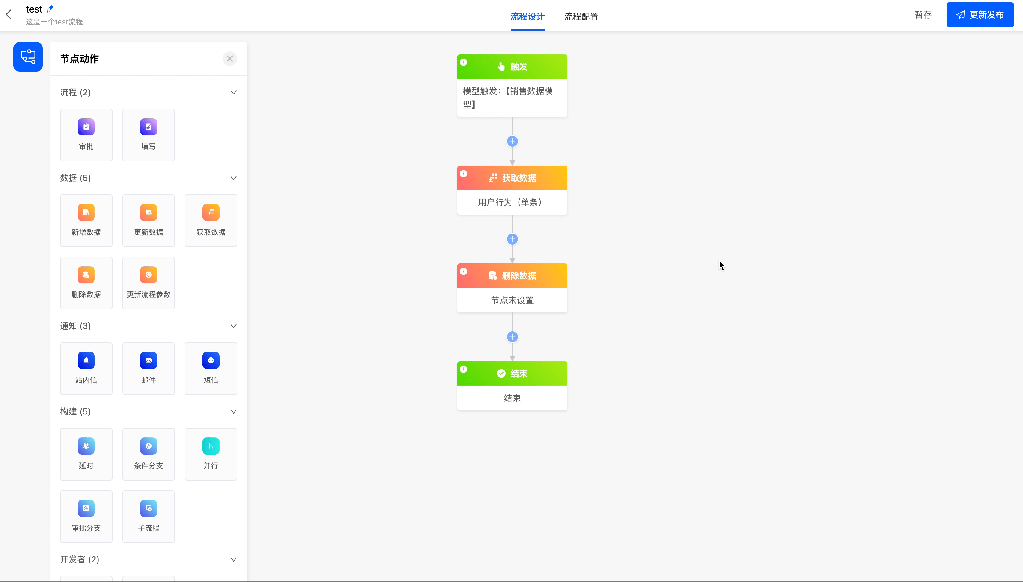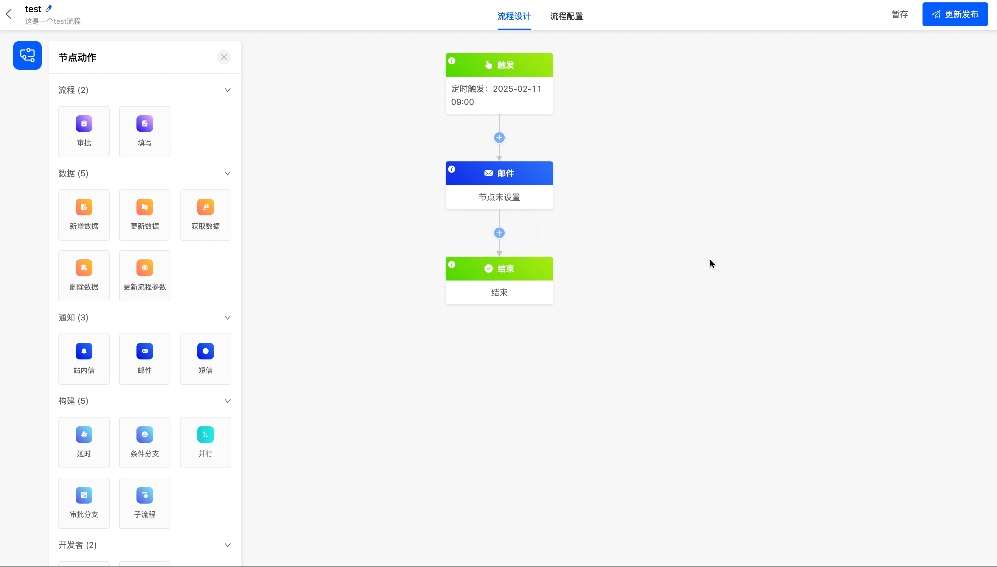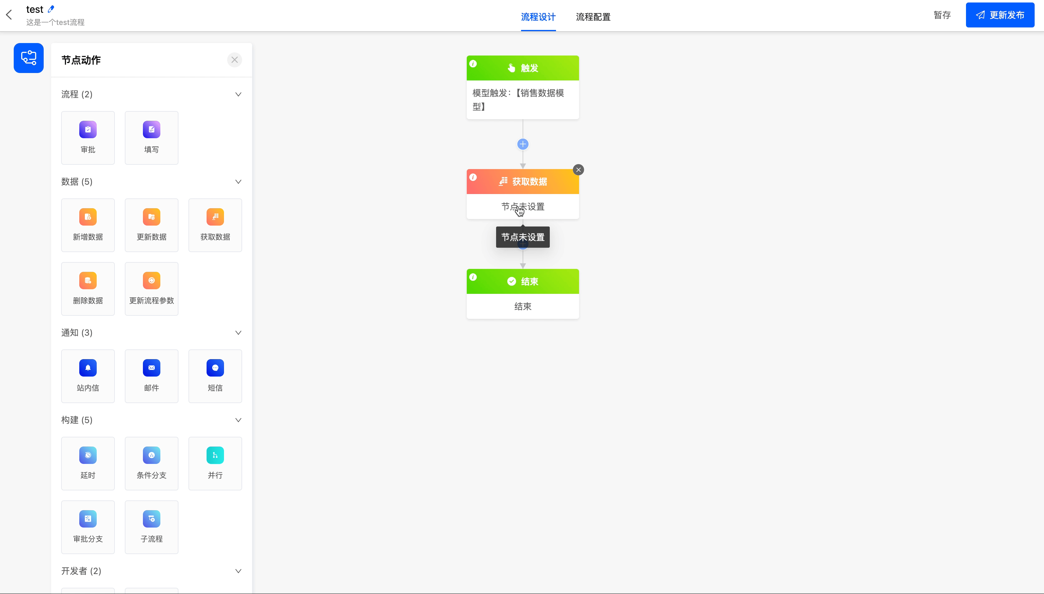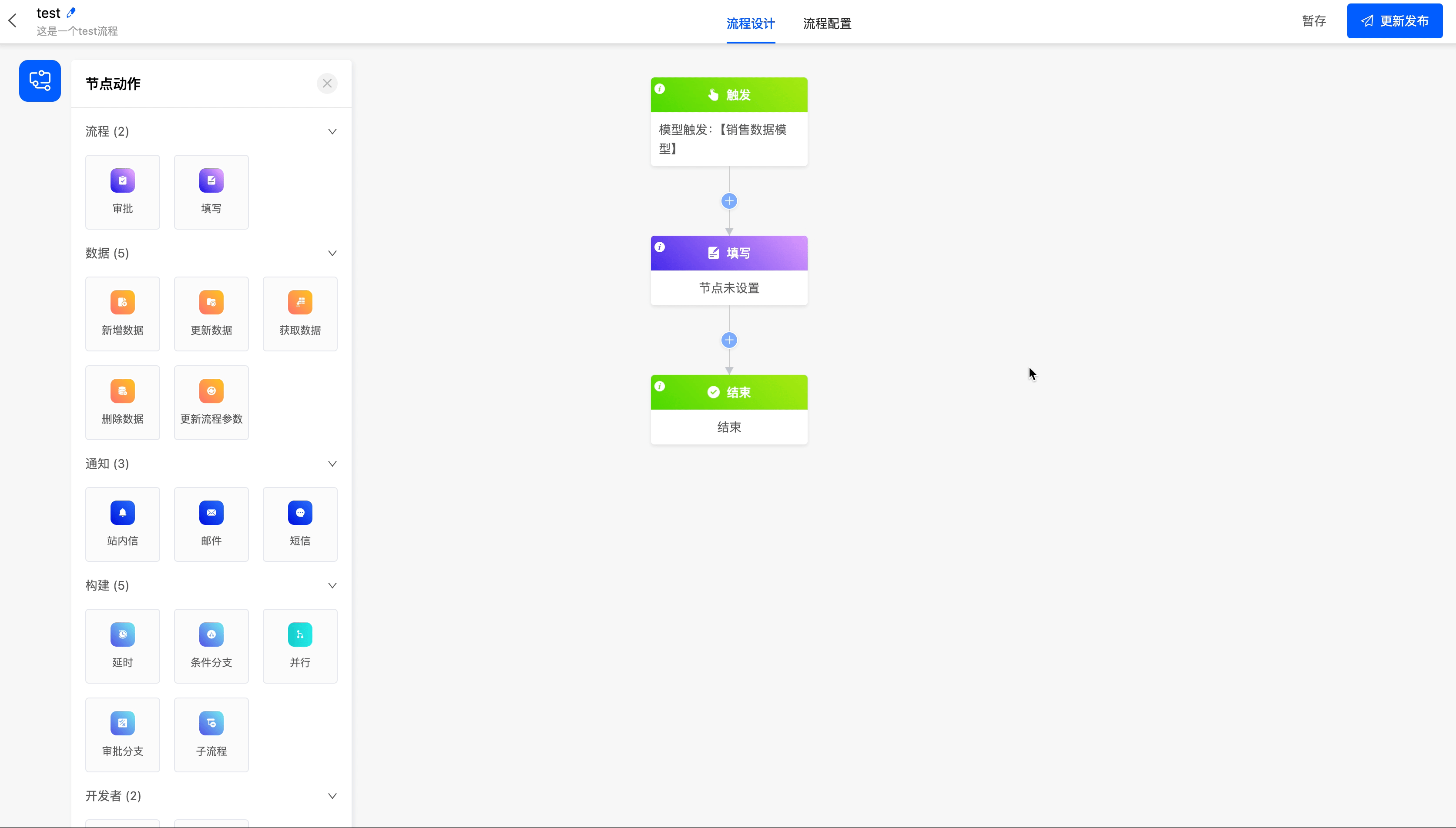 - After the trigger node is configured, there must be at least one node action between the trigger node and the end node; otherwise, the process cannot be published.