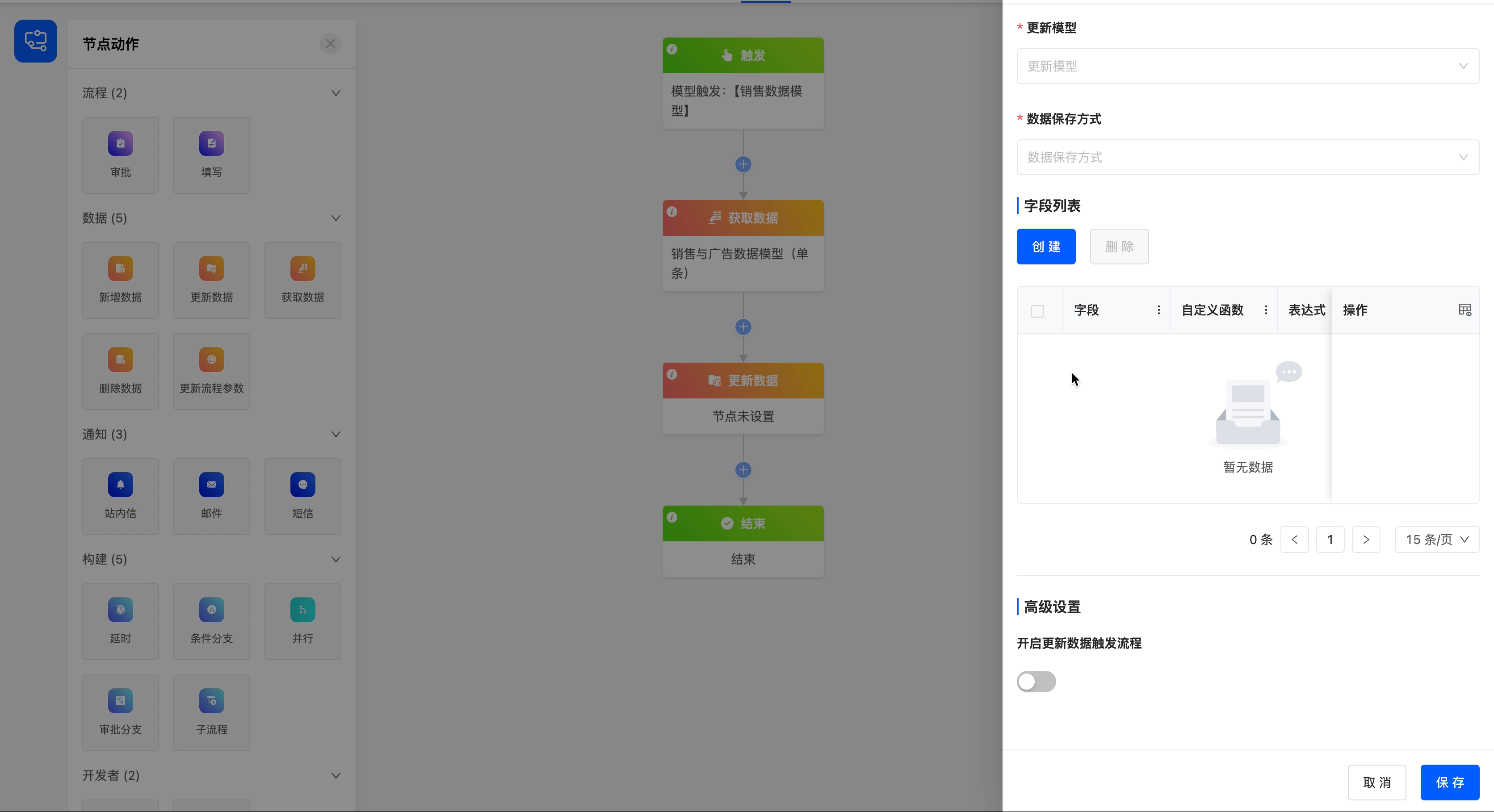 If you do not select updated fields or filter conditions, the process will be triggered when any field in the model changes according to the set scenario.