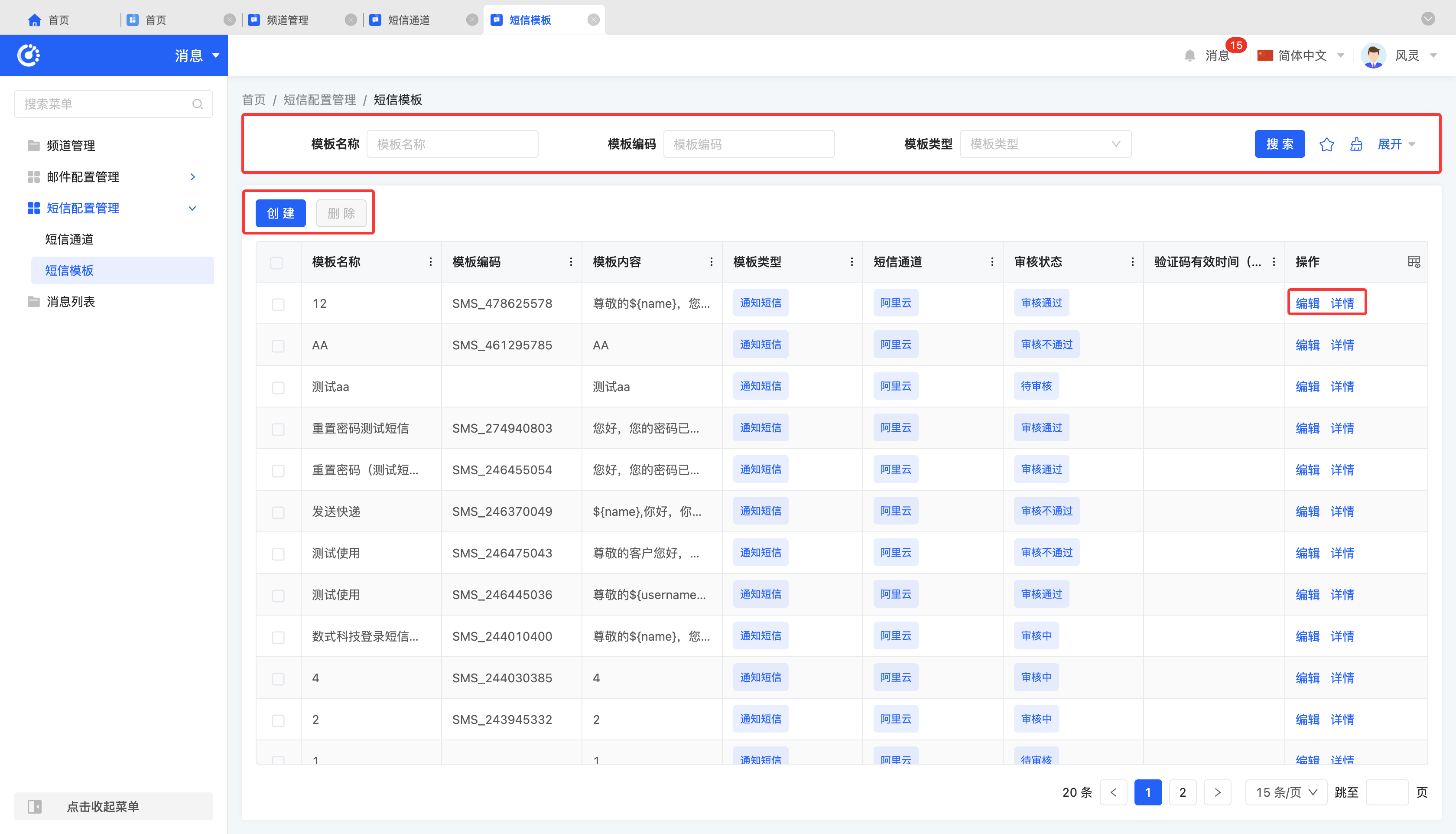 • Details: Click "Details" to view detailed information of the selected SMS template, including configuration parameters, status, etc.