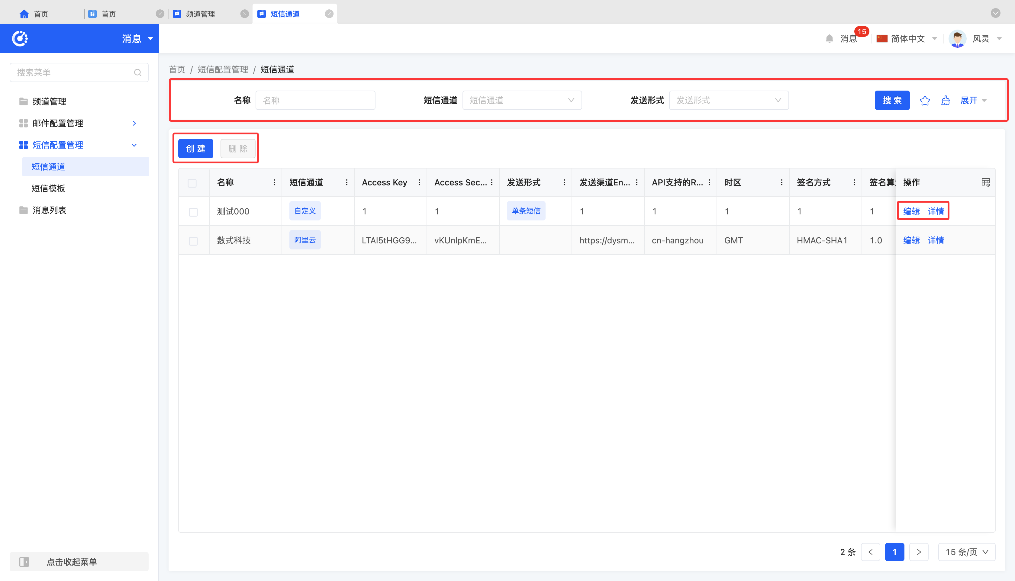 • Delete: Select an SMS channel and click "Delete" to remove the SMS channel.