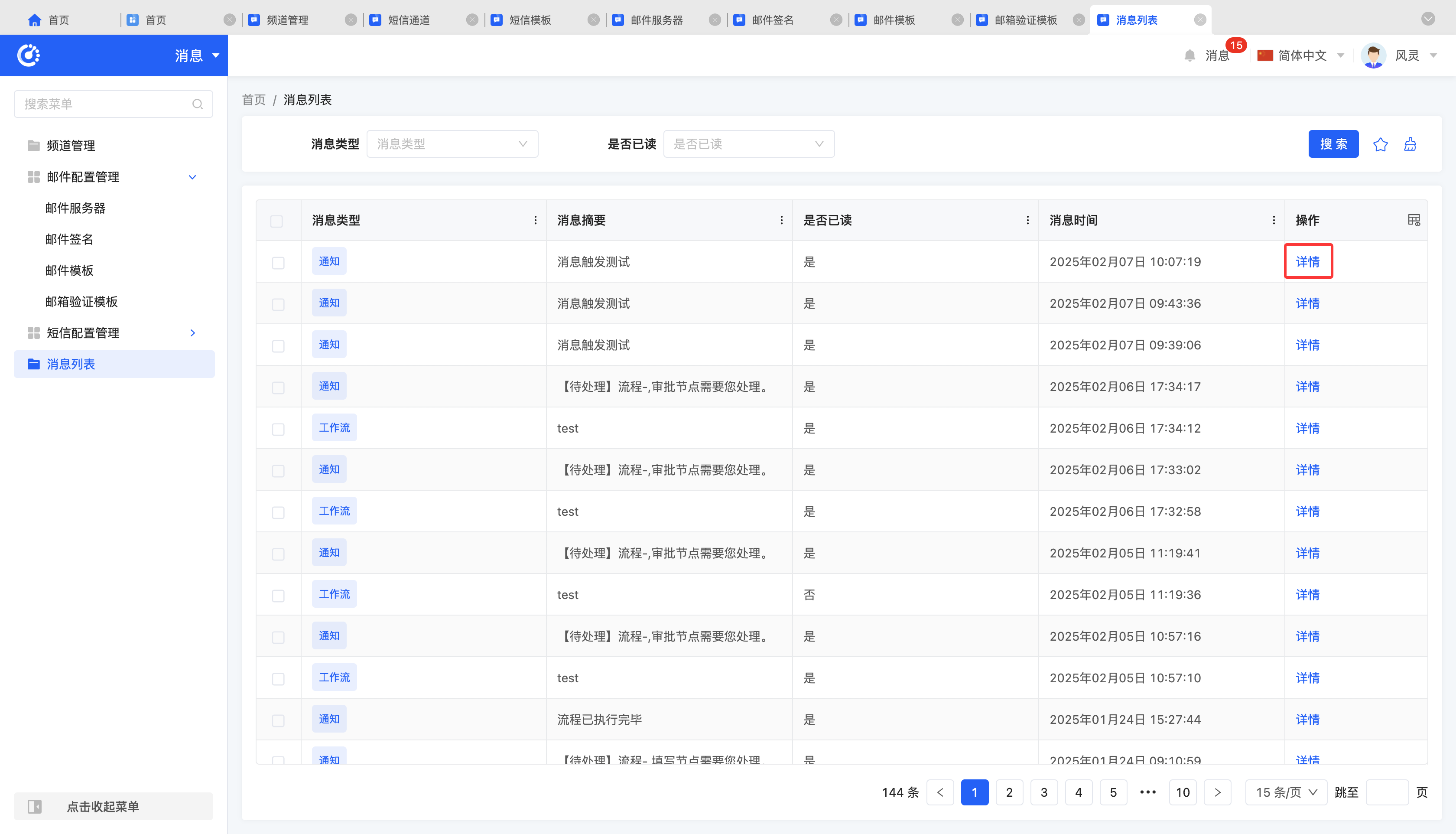 The message list is used to record in detail the execution status of various types of messages on the platform, covering multiple message types such as notifications, workflows, and carbon copies. Whenever a message is transmitted within the system, a corresponding execution record is generated and saved in the message list.