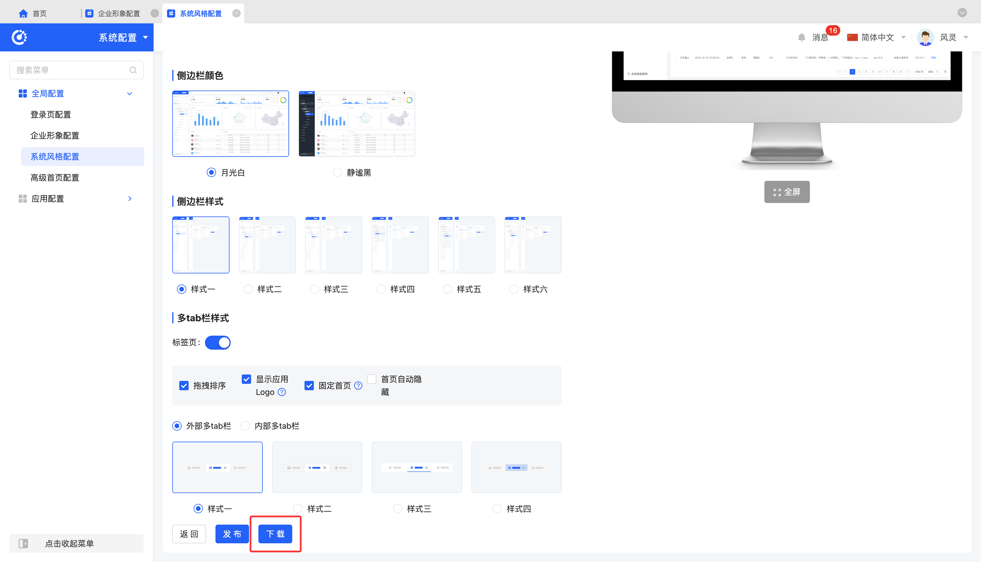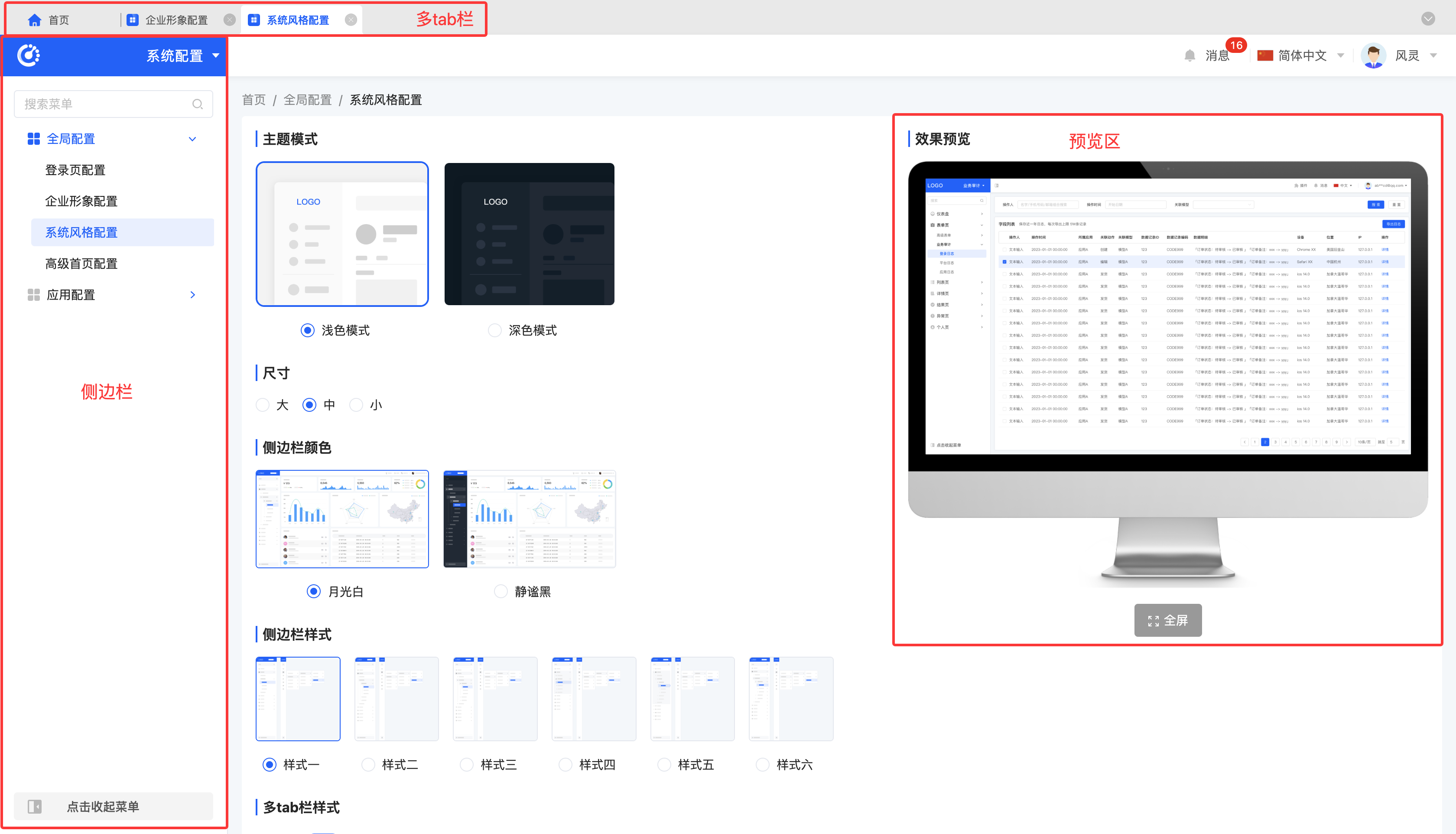 The system display style can be fully customized, including theme mode, size adjustment, sidebar color and style selection, and multi-tab bar style settings. During the setting process, you can preview the configuration effects in real-time, making the customization operation more intuitive and convenient. If the existing styles provided by the platform cannot meet your needs, you can also download the code for personalized style customization.