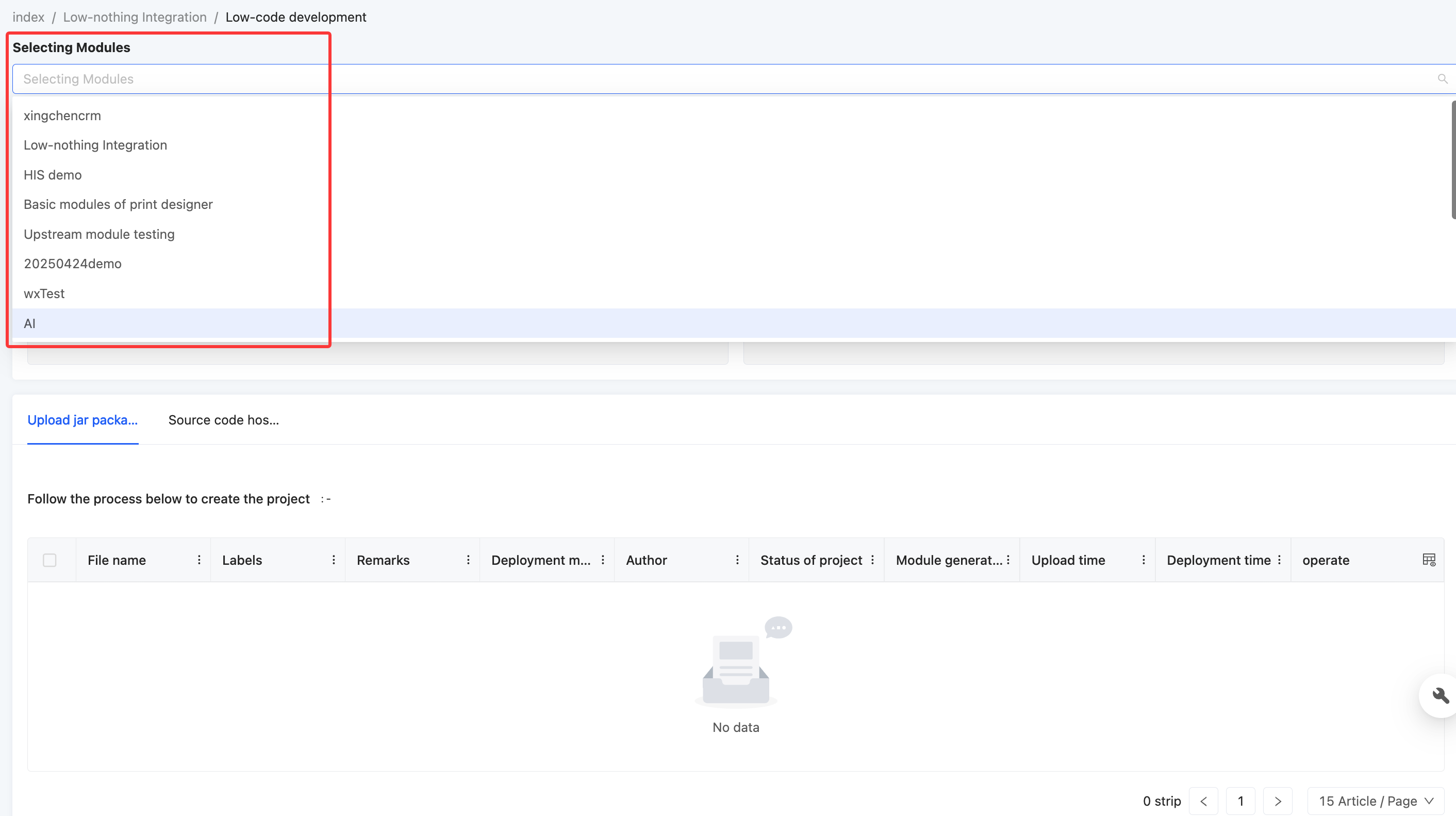 • Select the module or application that requires low-code design from the dropdown menu. After the selection, its module information will be displayed.